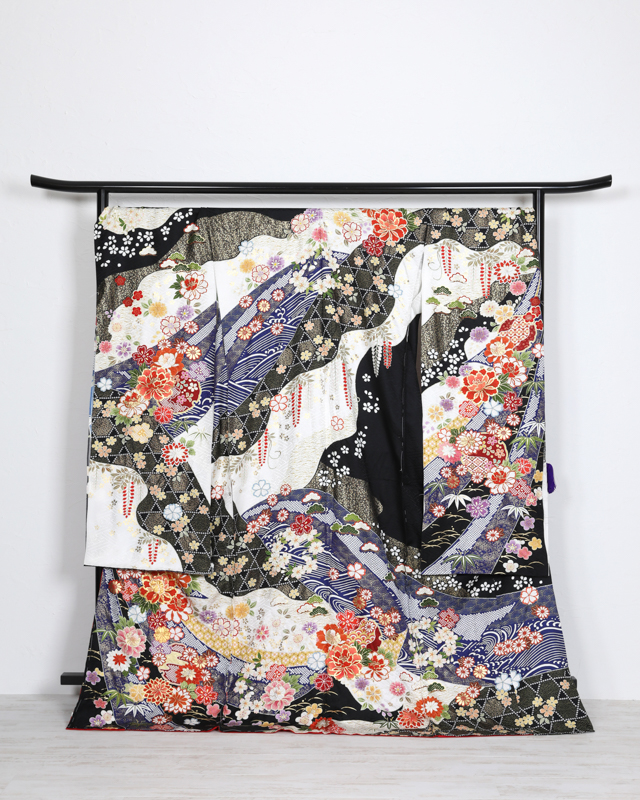 【振袖レンタル】G-3黒紺松竹梅疋田絞り刺繍